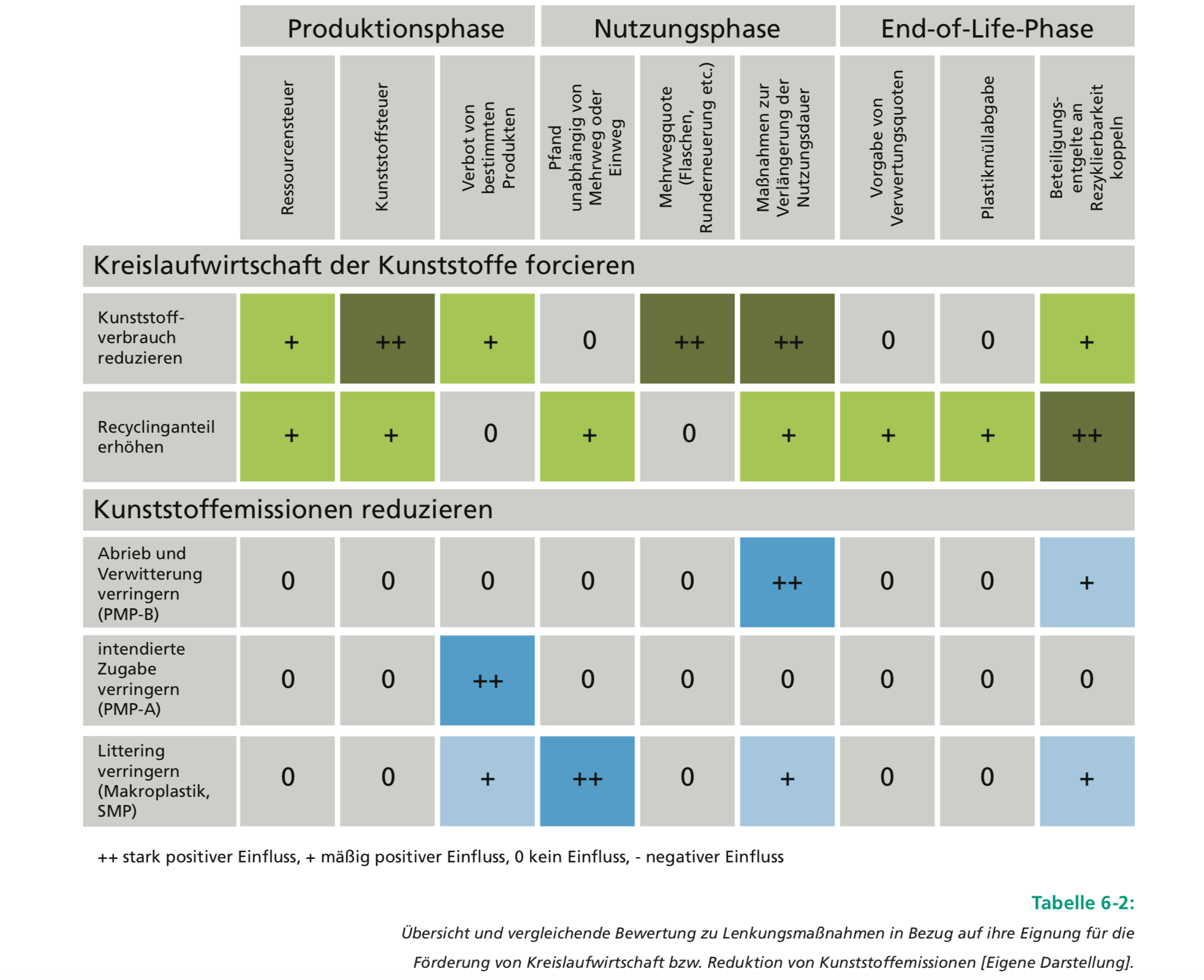 Das Fraunhofer Umweltinstitut hat dazu eine sehr spannende und interessante Tabelle aufgestellt, die eine Übersicht und Bewertung über die Punkte „Kreislaufwirtschaft der Kunststoffe forcieren“ und „Kunststoffemissionen reduzieren“ gibt.