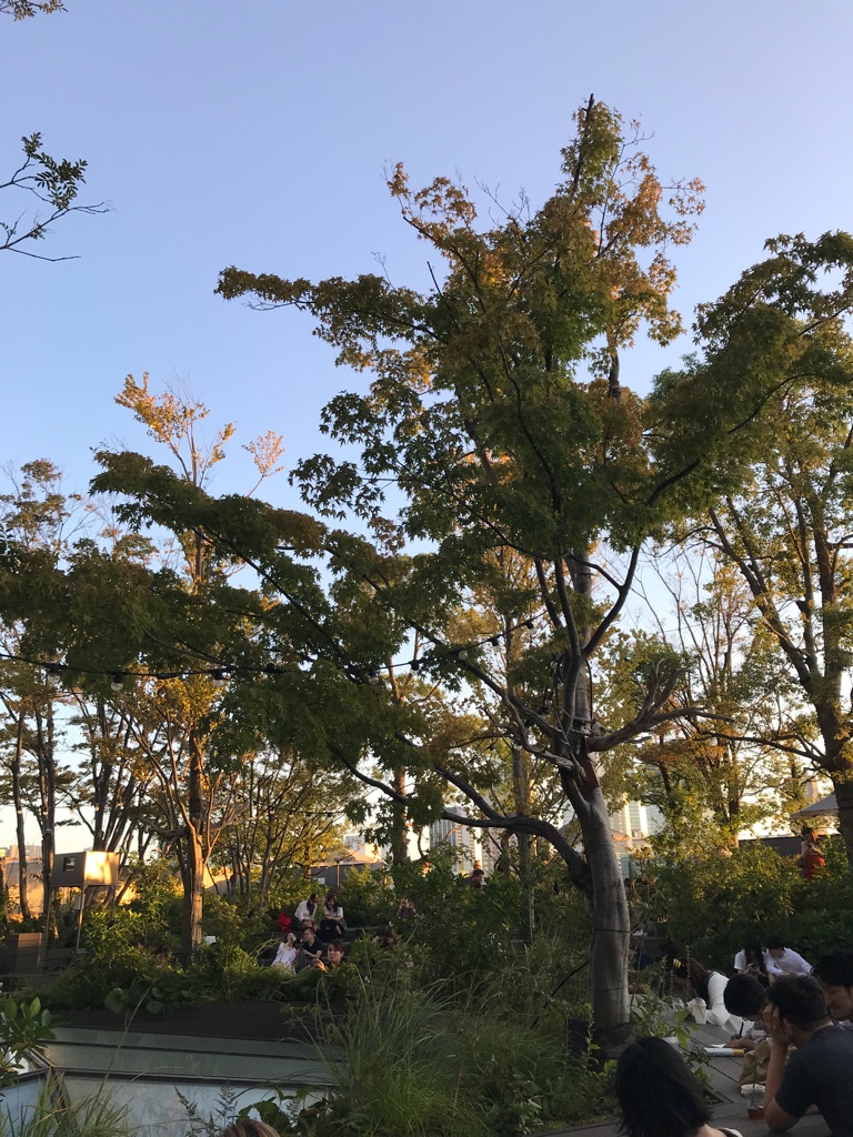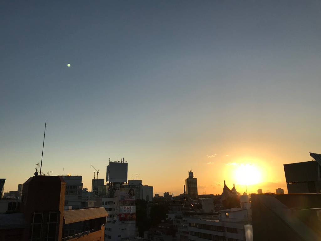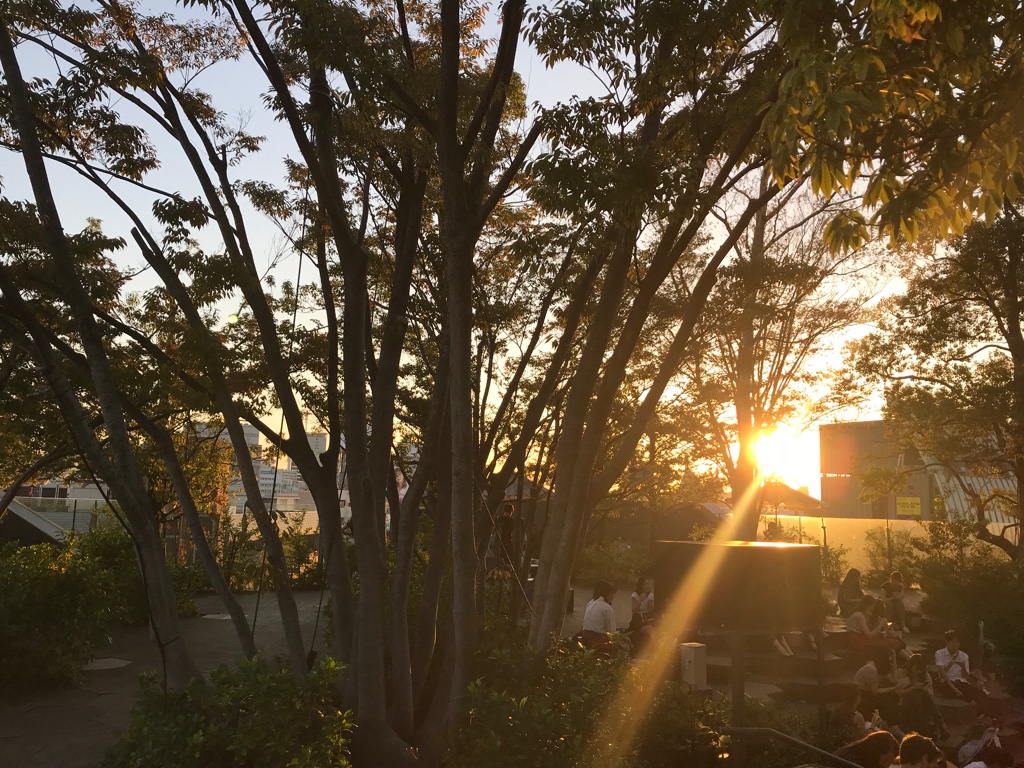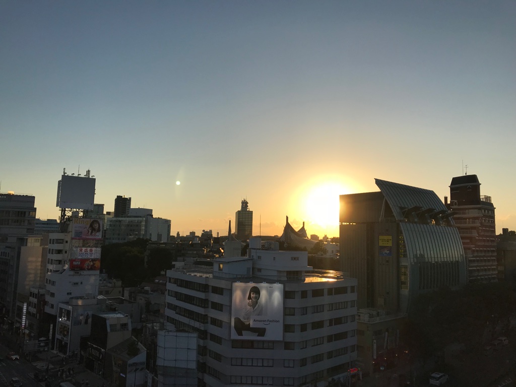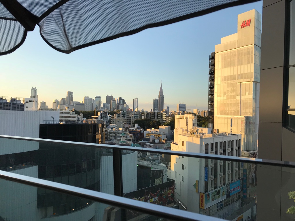 Danach sind wir weiter durch die hinteren Straßen der Omote-Sando geschlendert und an der Ecke in ein Einkaufszentrum hineingegangen. Dieses hatte eine wunderschöne Dachterrasse mit einem herrlichen Blick. Da die Sonne in Tokyo im Oktober bereits kurz nach 17 Uhr untergegangen ist, konnten wir die Abendstimmung mit Ausblick richtig genießen und haben sogar – ganz weit am Horizont – den Fuji gesehen.