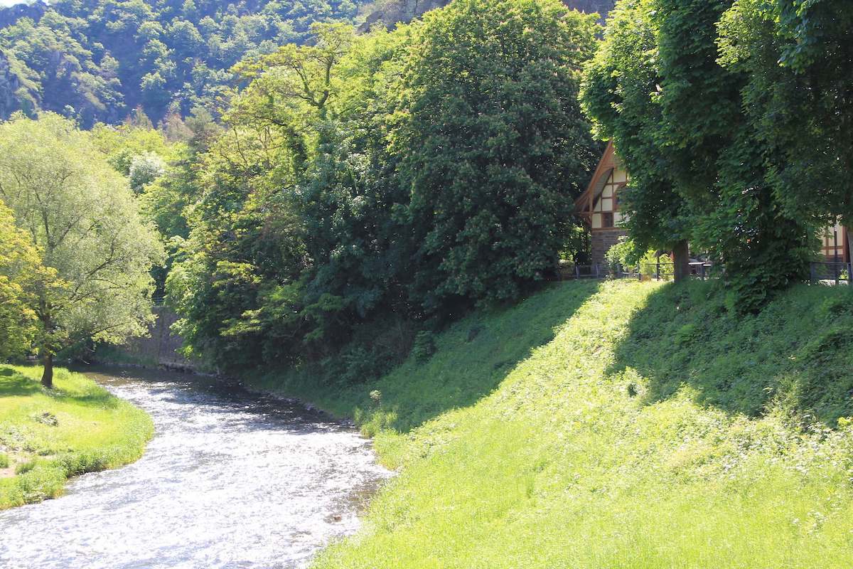 Am Samstag wurden wir von herrlichem Sonnenschein geweckt und erfreuten uns an der tollen Terrasse, die unsere beiden Zimmer miteinander verband. So konnten wir uns alle startklar für den ersten Tag im Familienabenteuer machen. Die Reise führte direkt nach Altenahr – knapp 20 Minuten Autofahrt von Bad Neuenahr-Ahrweiler entfernt. Die Fahrt Richtung Westen führte entlang kurviger Straßen und es wurde immer heimeliger. Die Landschaft war herrlich, denn alles war grün und der Fluss Ahr sprudelte neben der Fahrbahn.