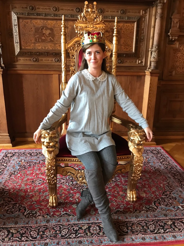 Über die Treppen gelangt man direkt in den oberen Stock und kann dort an der Selfie Station – das habe ich mir nicht ausgedacht, sondern nennt sich wirklich so – ein Foto mit Utensilien machen, um wahrlich wie ein König oder eine Königin auszusehen.