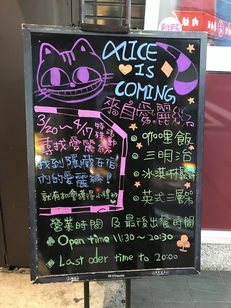 Da wir sicher noch ein wenig unter dem Jetlag litten, verging die Zeit wie im Fluge. Wer viel erlebt, dem wird auch schneller müde und für den Abend hatte Oli uns diesmal keinen Nightmarket rausgesucht, sondern ein ganz besonderes Restaurant. Ein Restaurant, das sich einem Mädchen aus einem Disneyfilm widmet. Ähnlich wie in Japan ist Alice im Wunderland auch in Taiwan sehr beliebt und so haben wir abends im „Alice is coming“ Restaurant gespeist. Alles war herrlich schön hergerichtet. Das Essen eher normal mit Sandwich, Burger, Nudeln und Pommes. Jedoch war das Erlebnis in einer übergroßen Teetasse zu sitzen diesen Ausflug wert. Ja, auch ich bin bekennender Disney-Fan und liebe Alice im Wunderland genau wie etliche andere Disneyfilme.
