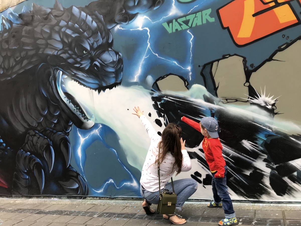 Nach dem späten Mittagessen – wir hatten uns für leichtes Sushi für uns und Reis für die Kinder entschieden – sind wir ein wenig durch die Straßen spaziert. Haben einen Umzug als Teil des Azalee Festivals beobachtet, mit Godzilla gekämpft und nicht schlecht gestaunt, was Licht im Dunkeln alles bewirken kann.