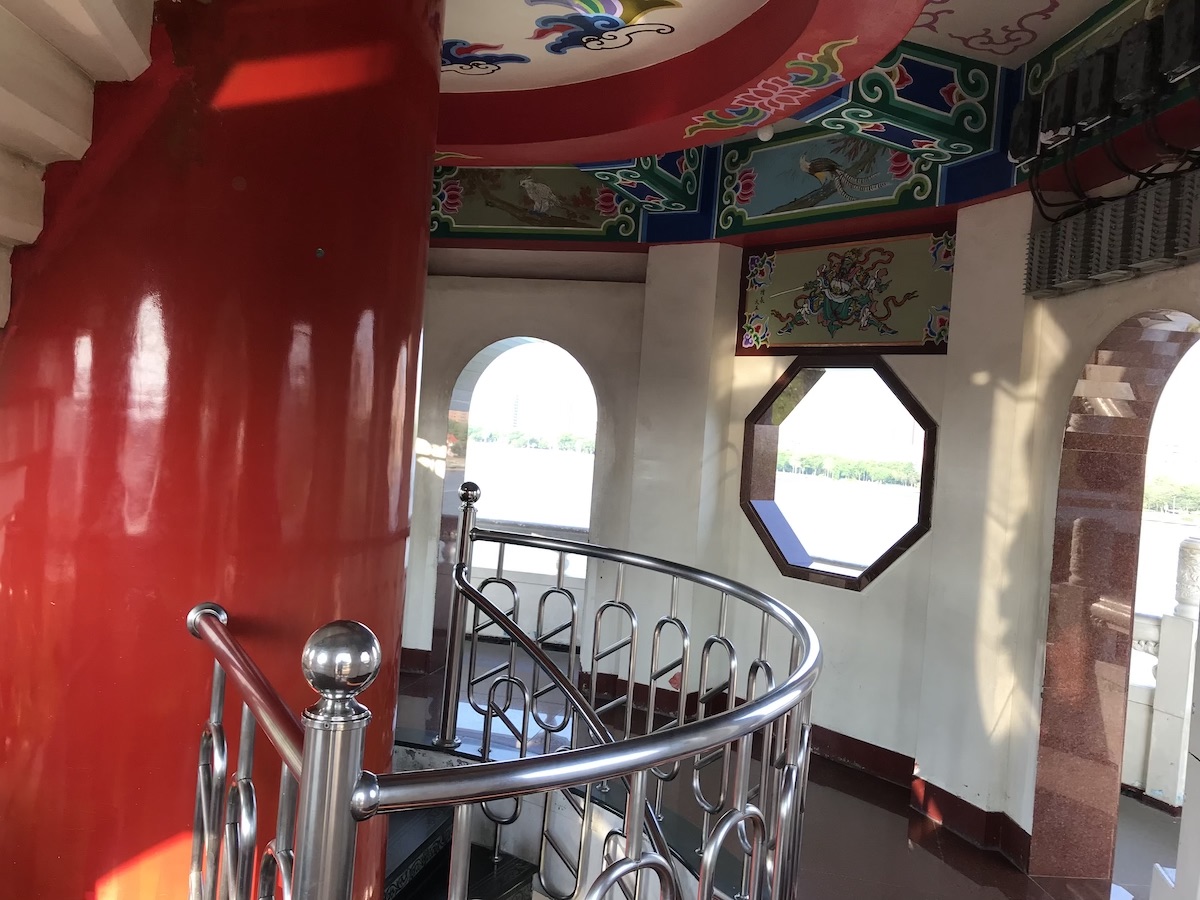 Die Tiger- und Drachenpagode war miteinander verbunden. In den Drachenmund geht man hinein und kann dann die sieben Etagen (Niveaus des Buddhismus) nach oben laufen – es gibt zwei Treppenaufgänge, die versetzt sind. So hört man sich die ganze Zeit, sieht sich jedoch nicht. Klar ist also, dass Junior den einen Aufgang genommen hat und ich den anderen. Bei Hitze, Feuchtigkeit und jeder Menge Sonne ein absoluter Kreislauftraining. Wir haben uns danach den gleichen Weg auch in der Tigerpagode „angetan“ und sind dann durch den Tigermund rausgekommen.