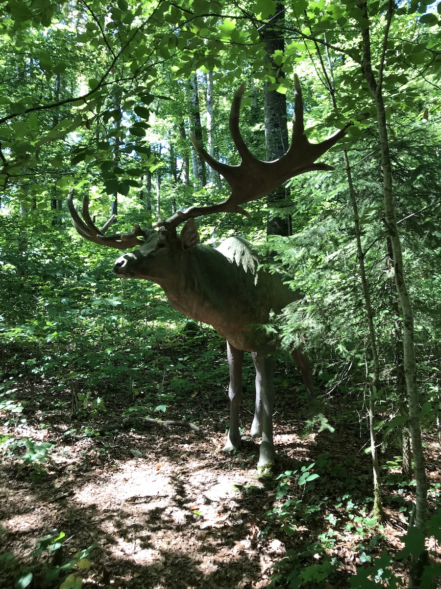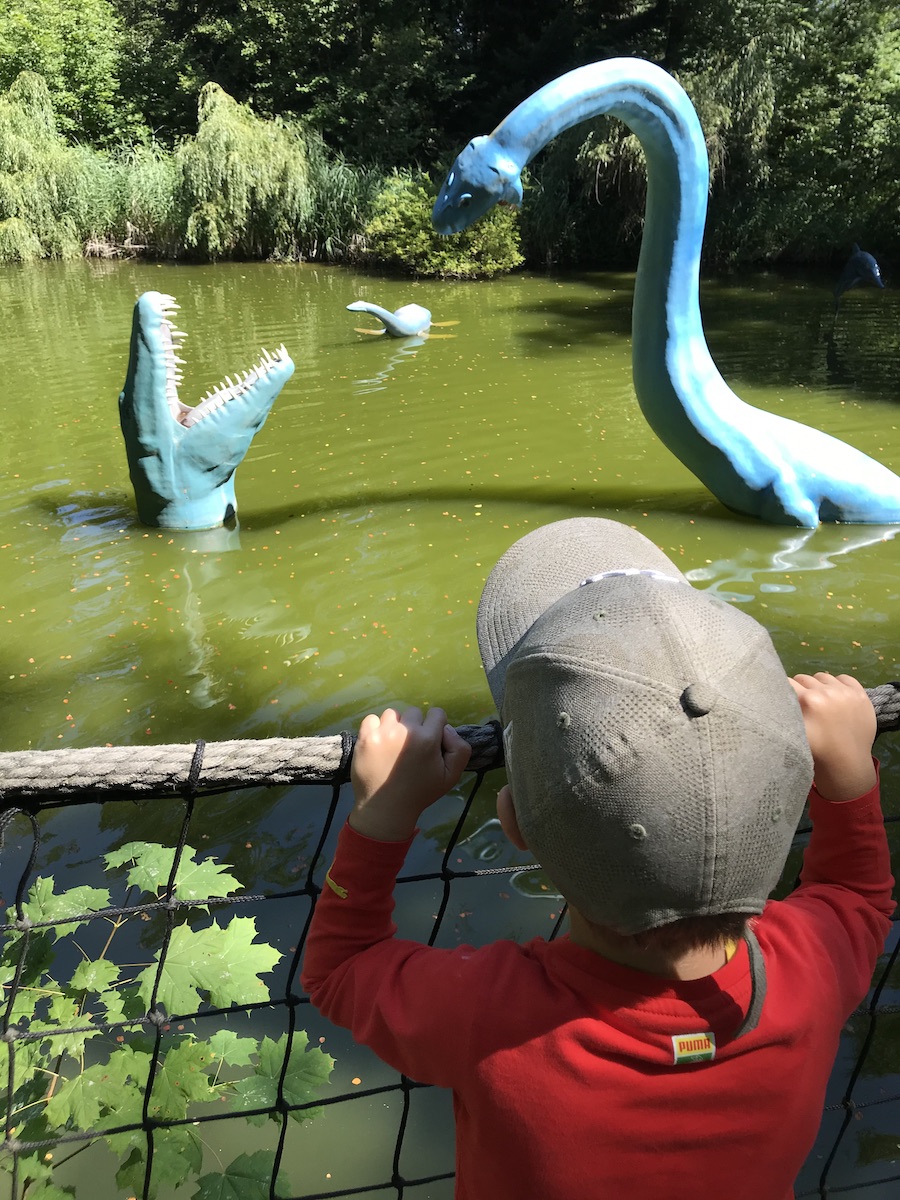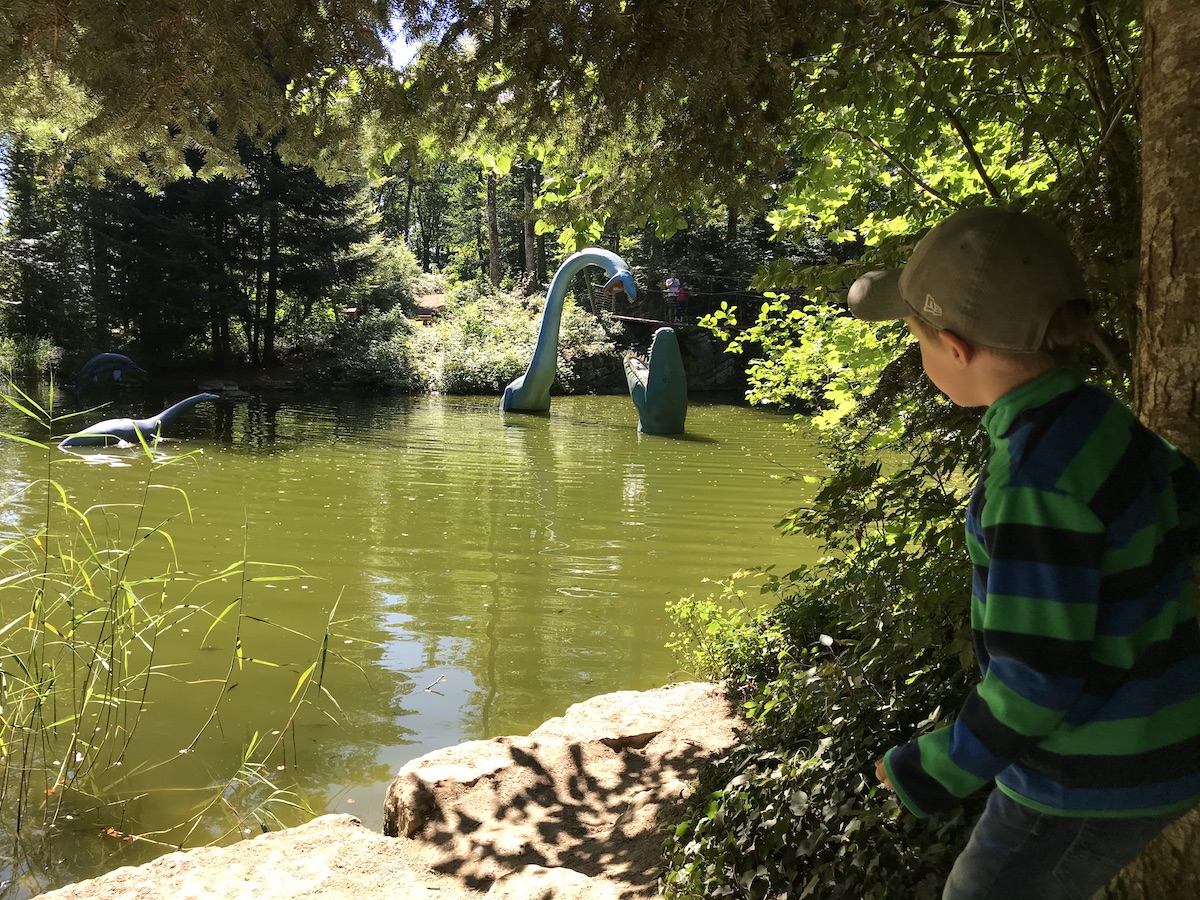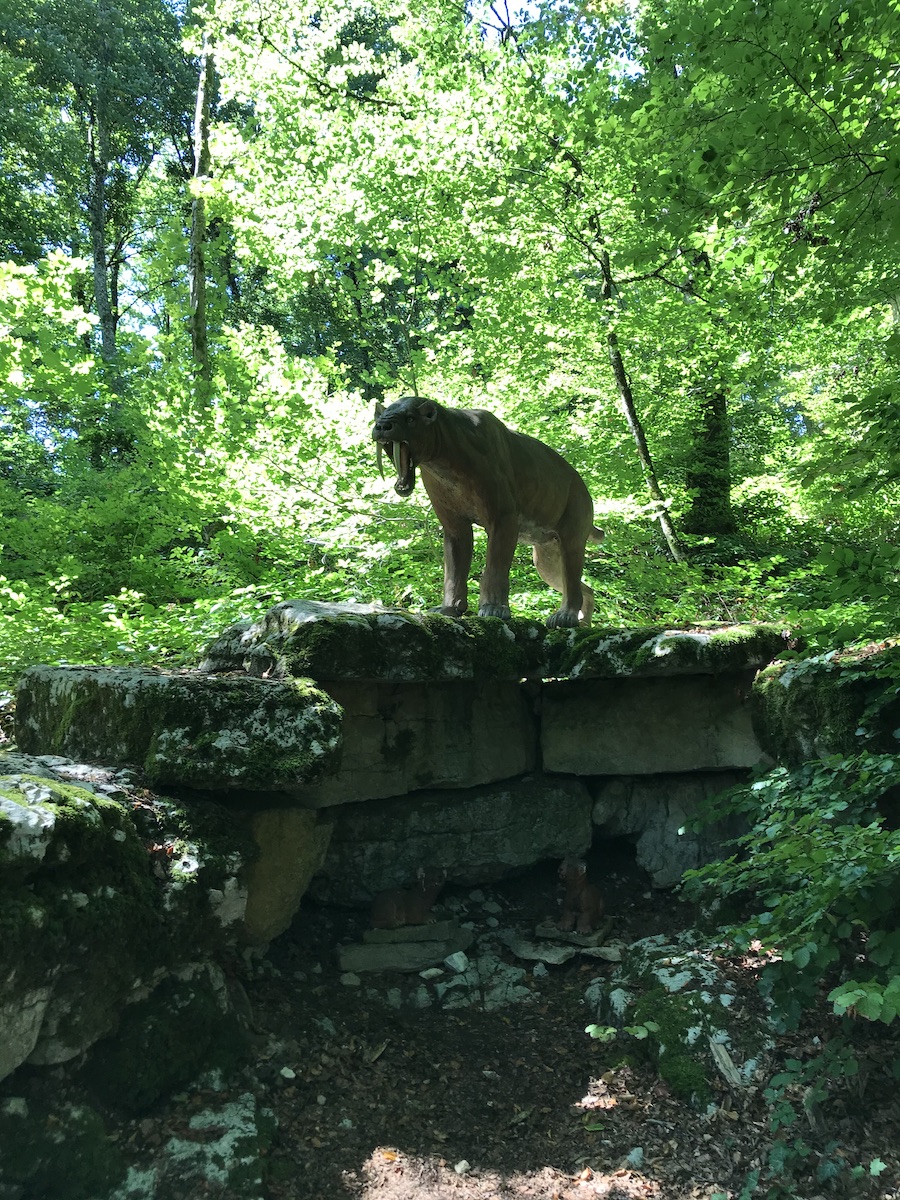 Ein weiteres Highlight war für uns der Besuch des Préhisto-Parc. Dieser zwei Kilometer lange Rundgang ist gesäumt von 45 lebensgrossen Reproduktionen von Dinosauriern. Da diese Attraktion draußen und im Wald ist, finde ich sie ideal für den Sommer, Frühling und Herbst. Es wurde nämlich bei uns schon am zweiten Tag wieder klarer und die Regenwolken verzogen sich. Die dadurch entstehende Hitze ist sicher nicht so hoch wie in den Städten, jedoch tat die Abkühlung im Wald sehr gut.