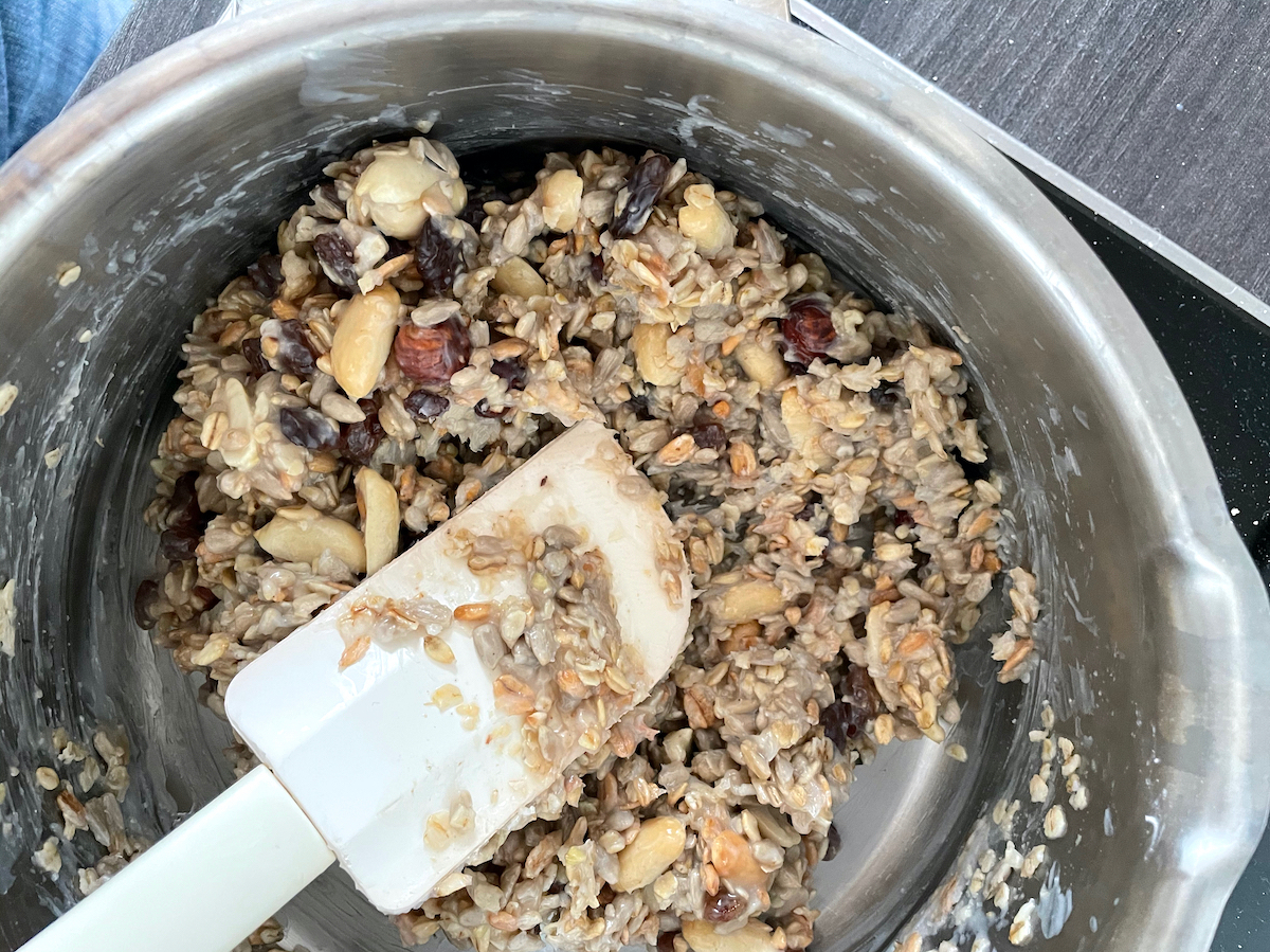 Das Fett in einem Topf langsam schmelzen lassen. Die Nüsse und Körner hinzufügen – je nach Gusto auch die Rosinen. Wir haben bisher immer sehr gute Erfahrungen mit den Rosinen gemacht und die Meisen haben diese besonders geliebt.